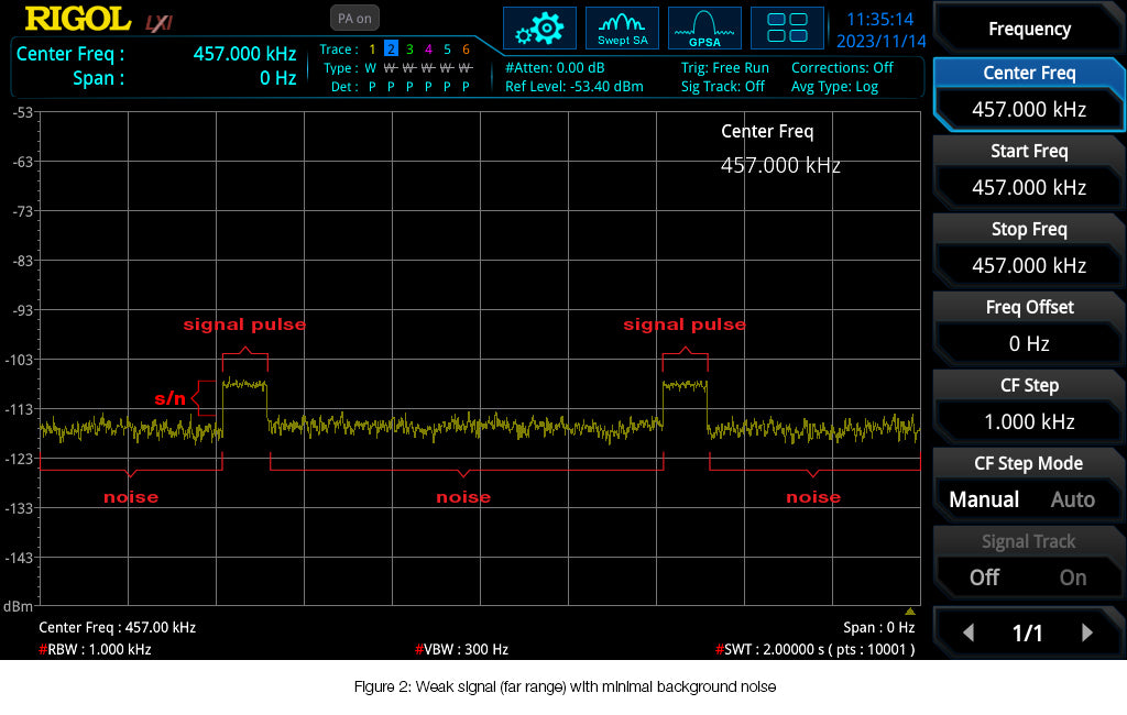 As you get further away from the transmitting transceiver and the signal becomes weaker, it looks more like Figure 2 below. Notice the decreased signal to noise ratio.