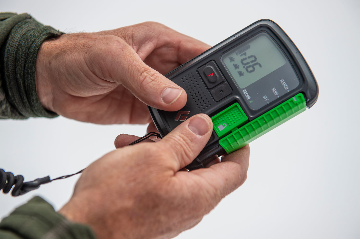 Various electronics often found in the backcountry were used in our test, including smart watches, GPS watches, smartphones, two-way radios, action cameras, satellite communication devices, electronic airbag packs, and even a snowmobile. The searching transceiver was held at 50cm from the torso using a static tether to help maintain the appropriate distance. Each item was then placed in a normal use position as noted below.