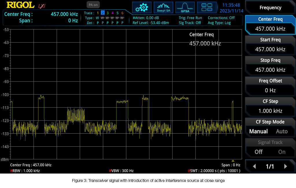 The above images show the transmitting transceiver signal in a relatively noise free environment. If interference from another electronic device is introduced, the S/N ratio will decrease even further as spikes in noise will begin to drown out the desired transceiver signal making it indistinguishable. Can you tell the difference between the transceiver signal and noise spikes caused by active interference in Figure 3 below?