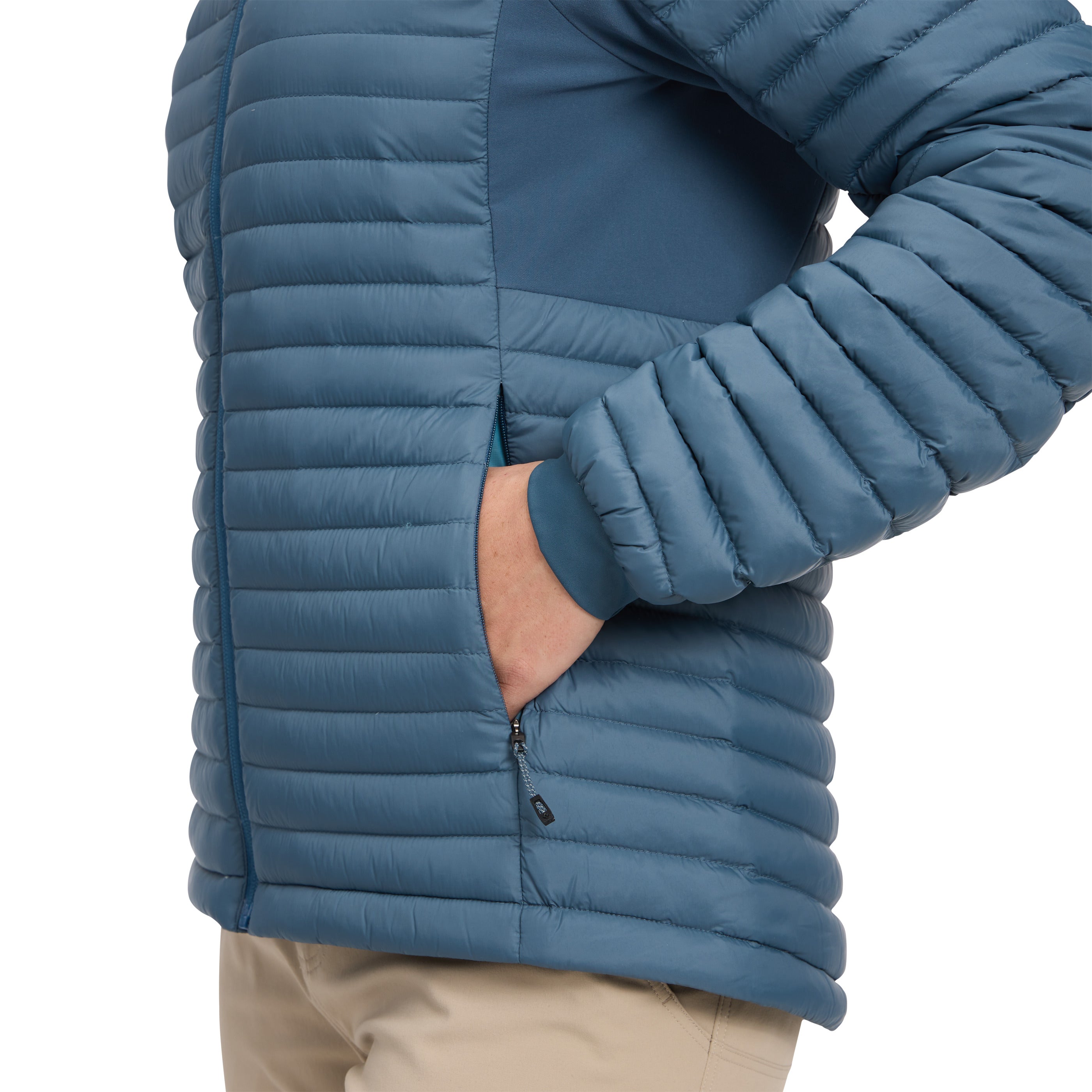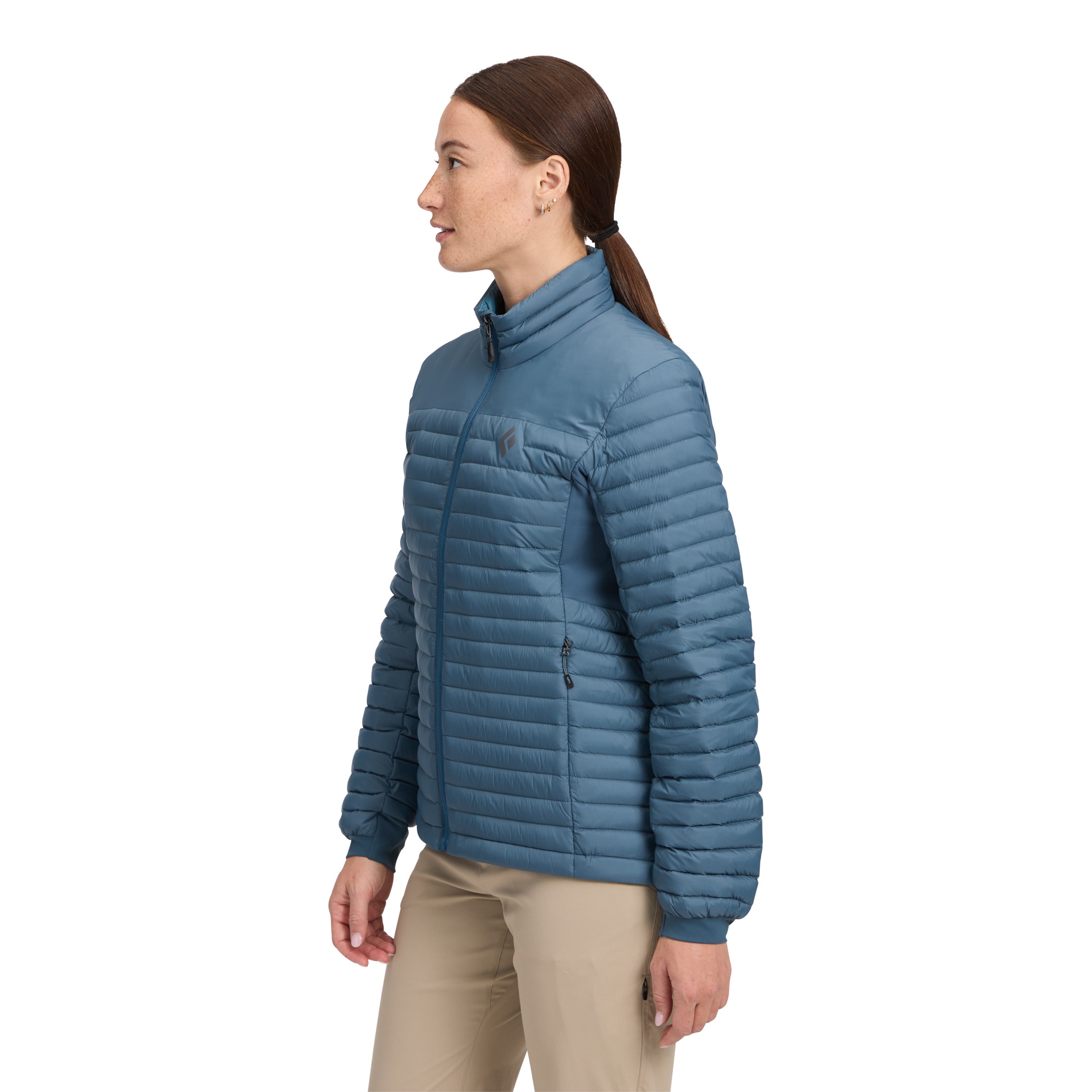 The jacket’s 700-fill goose down keeps you warm while a 20D nylon face fabric that’s finished with a PFAS-free DWR coating provides light weather resistance. Stretch woven fleece side panels add range of motion and packability. Two zip hand pockets, an internal zip pocket, and stretch knit cuffs round out the features of this cold-weather active-insulating layer.